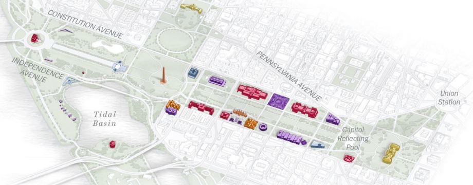 The Mall today, with the addition of the new National Museum of African American History & Culture immediately to the northeast of the Washington Monument: