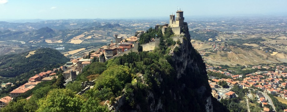 The country is surrounded by Italy and located immediately inland from the Adriatic. Most of the microstate is perched atop the three peaks of a formidable mountain – Monte Titano: