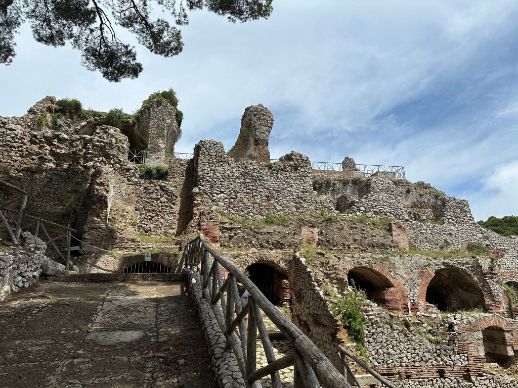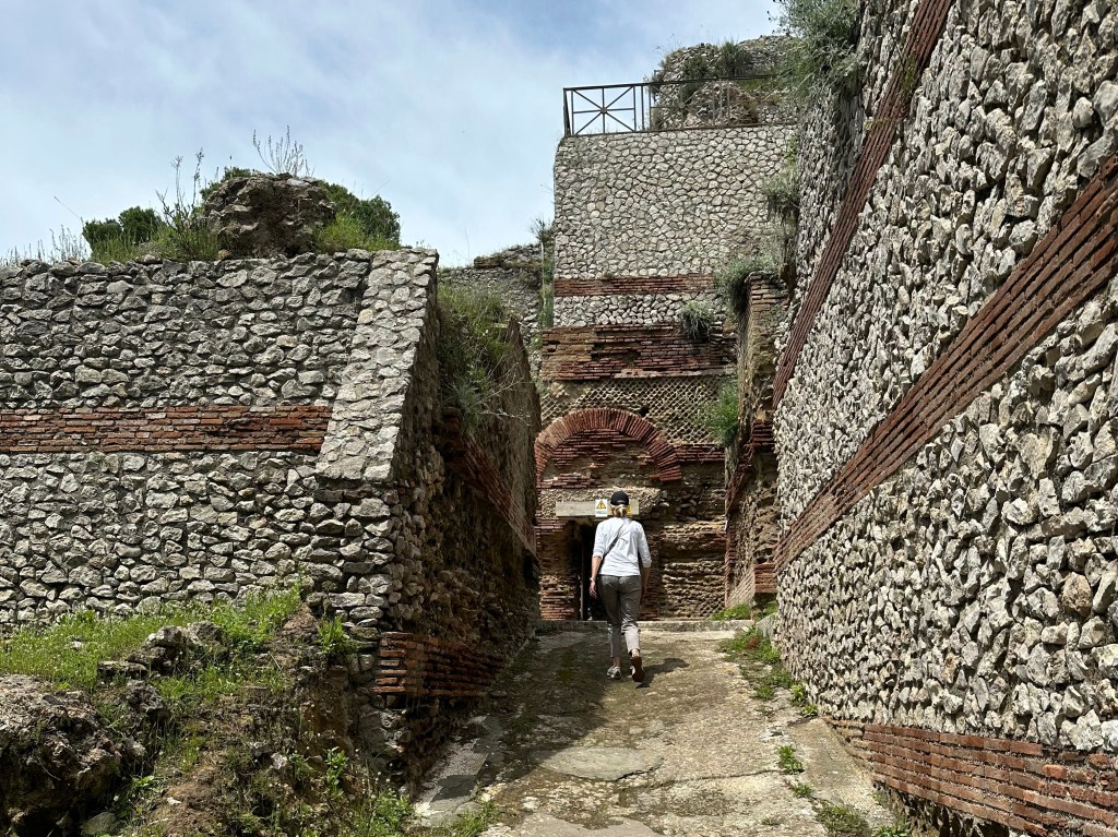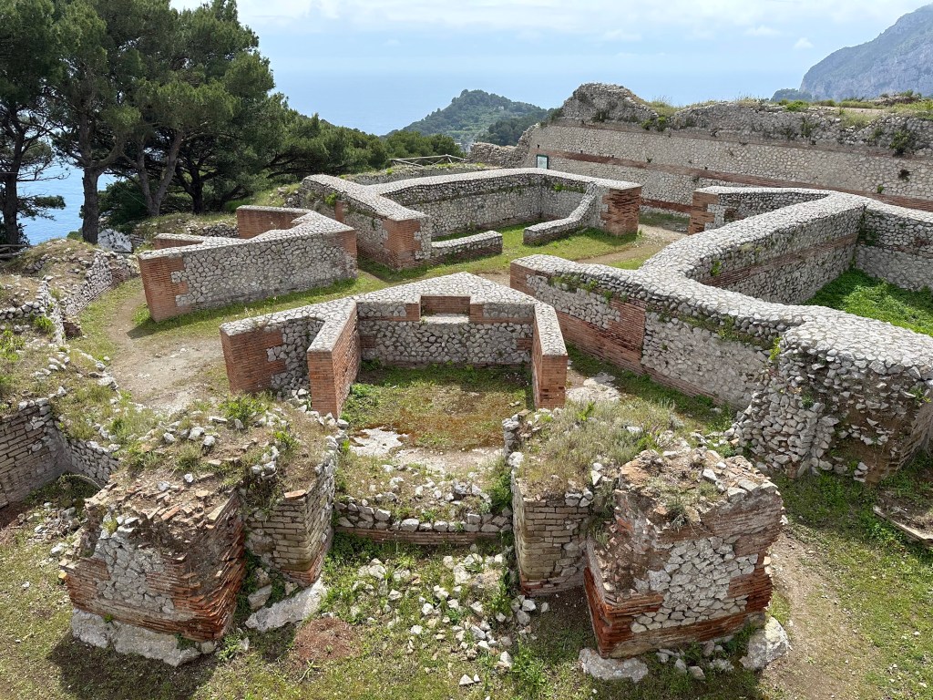 “Apparently, the main motivations for Tiberius’s move from Rome to Capri were his wariness of the political maneuvering in Rome and a lingering fear of assassination. The villa is situated at a very secluded spot on the island and Tiberius’s quarters in the north and east of the palatial villa were particularly difficult to reach and heavily guarded.” (From here.)