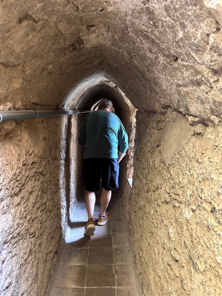 Climbing through one of the passageways in the fortified tower: