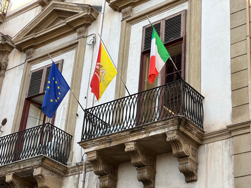 Sicily’s super-intriguing Trinacria flag, flanked by the EU and Italian flags on balcony in town. We’ll get into that little vexillological nugget in a future post, featuring beer. Cold, delicious beer. Mmmm; beer.