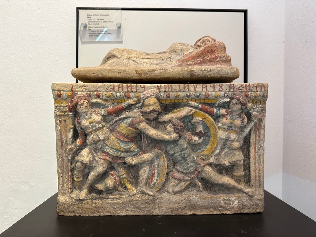 And a 2nd-century BC gladiator-themed, painted terra cotta, urn: