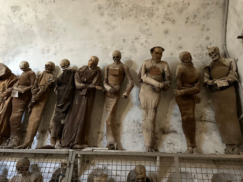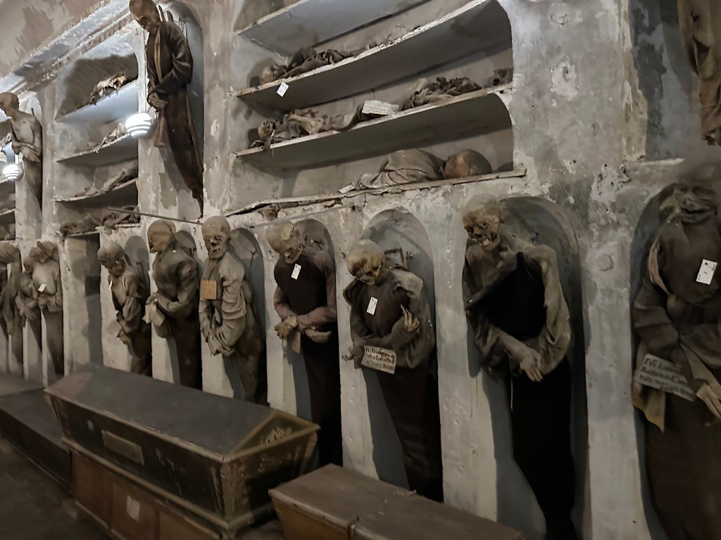 And with full bellies, and not a fear in the world of our lunch being returned to the outside world, we headed through town to the Capuchin Catacombs of Palermo, which contain around 8000 corpses and 1252 mummies; the last body was interred in 1939.