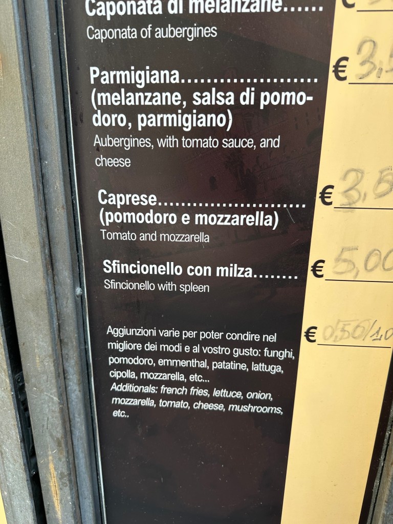 Would love (love!) to report that it’s splendid (hahahaha!), but 4/10 – would not recommend. And for context, we’ve had foal in Slovenia, brain in Hungary, and puffin in Iceland.  (But our niece, Tara, who visited Sicily during her time in Italy, apparently digs it!):