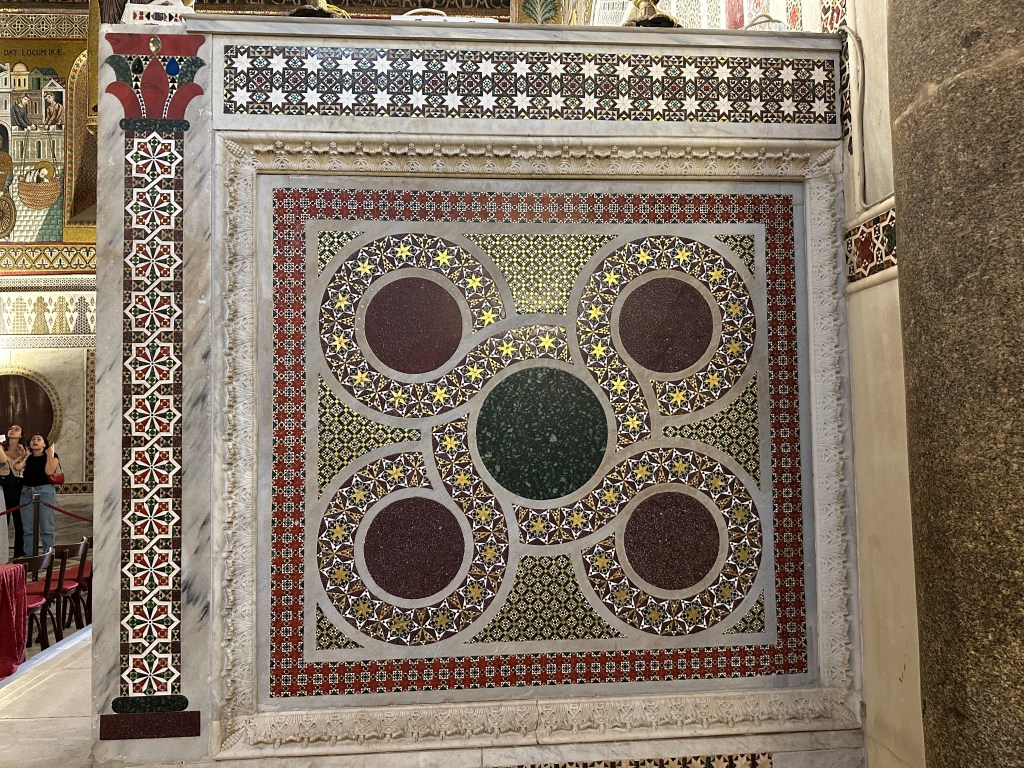 To wit: a Norman church structure adorned with Byzantine-style mosaics and topped with a Fatimid-style muqarnas ceiling (identical in style to those we experienced at the Moorish Alhambra in Granada):