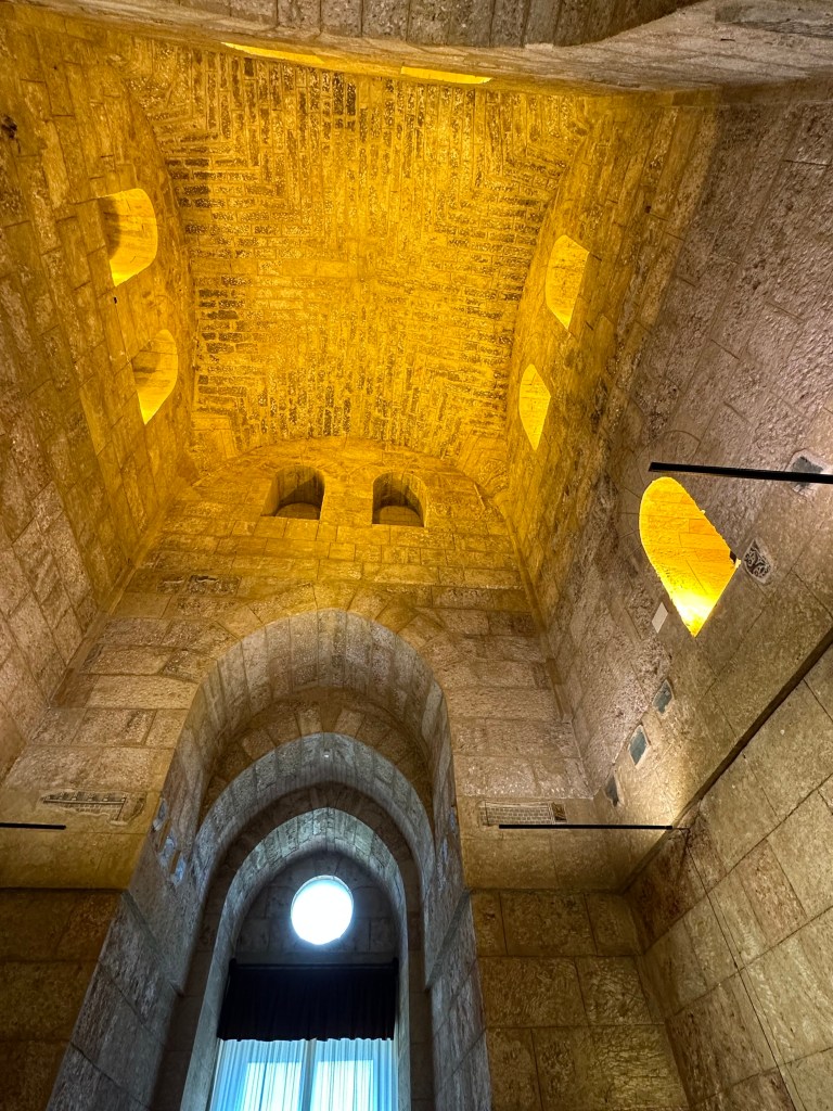 The palace’s core was marked by four towers and included facilities such as workshops and textile laboratories (nobiles officinae or tiraz). It served as the seat of successive Norman courts, including those of Roger II, William I (known as “the Mean”), and William II (“the Good”), who oversaw a remarkable confluence of diverse cultures. Frederick II, grandson of Roger II and son of Henry VI of Hohenstaufen and Constance of Altavilla, continued this legacy. He played a pivotal role in its administration and in fostering cultural life, notably supporting the Sicilian School of poetry.” (All from here.) [BTW, we also would highly recommend the podcast “Norman Centuries” by Lars Brownworth; outstanding!]