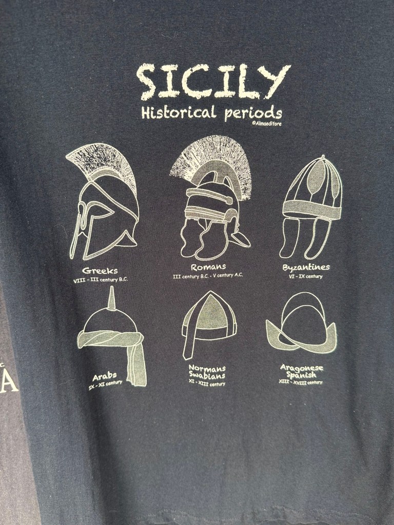 Below, a brief overview of each of those helmets provides a reasonable starting point to Sicily’s millennia of history (plus the addition of two critical cultures by WolfeStreetTravel that are not included on the T shirt and represent egregious omissions – you’d think all tourist T shirts would have been subjected to a rigorous peer review process and thorough QC before being printed!):