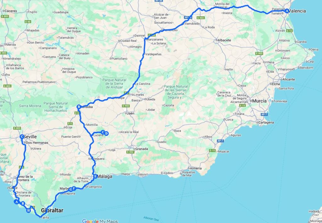3. Then flew to Valencia at the 6:00 spot, after a couple of days there, we began an 9-day drive west to multiple locations in Andalusia in Spain