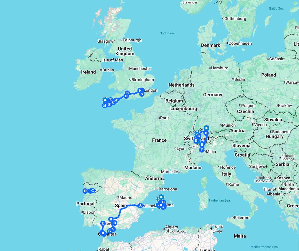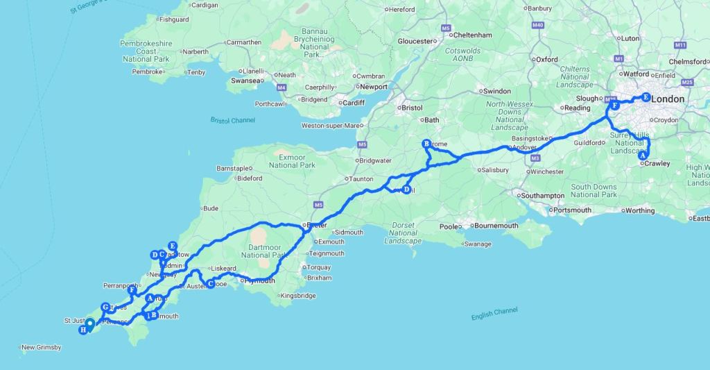 5. And finally ended the trip at the 12:00 spot with a 10-day loop around Cornwall and back to London in the UK