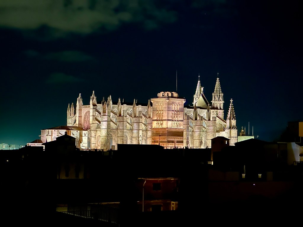 Palma’s cathedral lit up at night from our terrace: